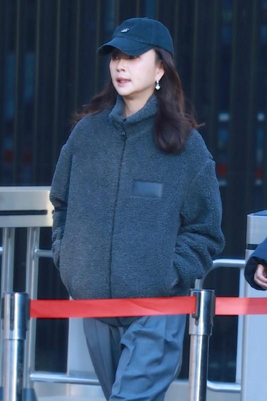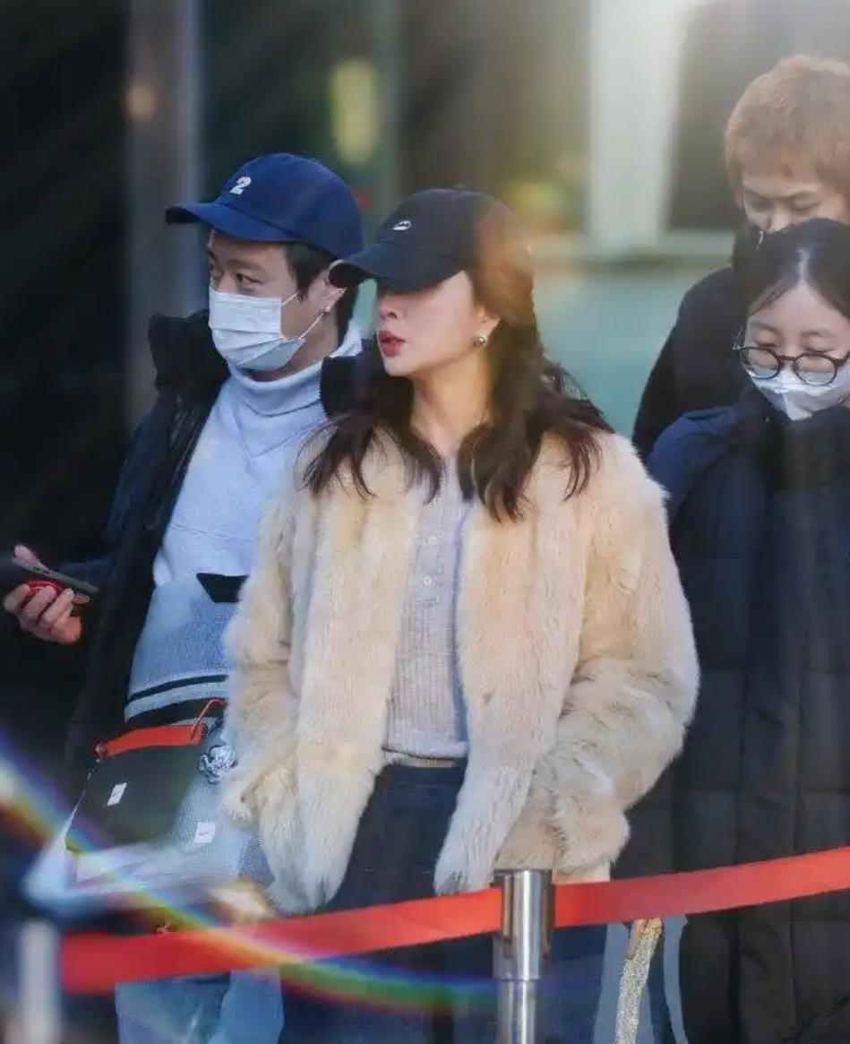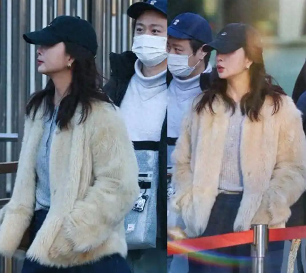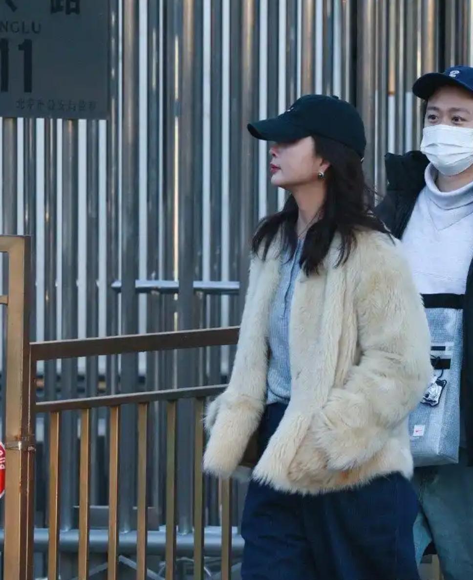 46歲殷桃路邊被偶遇,穿皮草配棒球帽,不僅不太俗,意外時尚高級