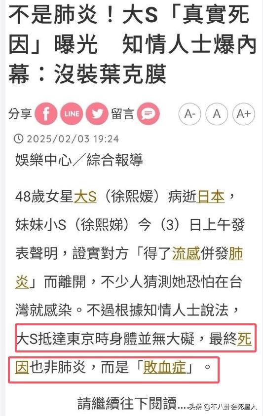 根據臺灣媒體的證實,大S最終是因流感病發肺炎,但最終是因患敗血症而無力搶救,最終離世的。