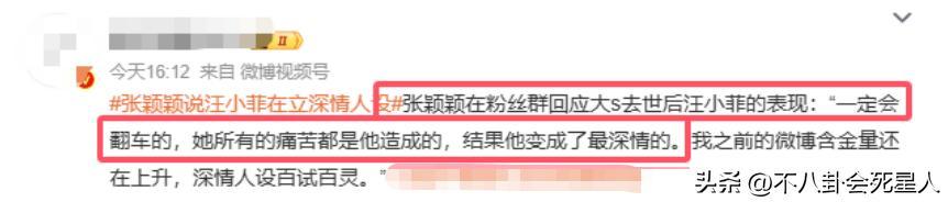 難怪汪小菲的前女友張穎穎在粉絲羣裏揭露其真相,稱汪小菲是在立深情人設,並一語道破天機,稱大S的所有痛苦都是他造成的,最後他卻變成了最深情的人。