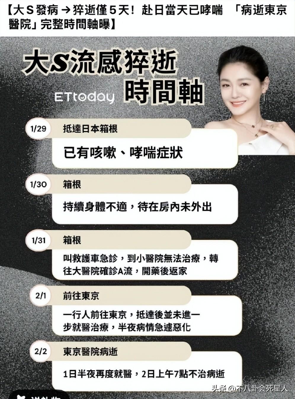 而大S的病症在徹底爆發之前,她也僅僅是到小醫院診治,無法治療的情況下,再次轉診到大醫院,卻也僅僅是開藥後回家休息,兩次就醫的機會均未得到家屬的重視,導致其最終半夜病發,無力迴天。