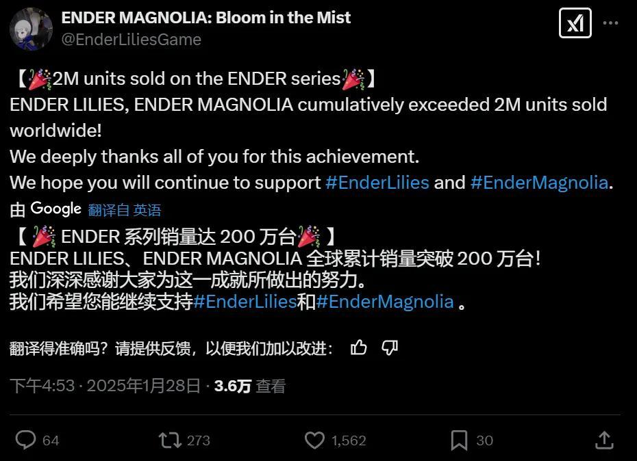 就在遊戲正式發售四天後,官方推特賬號公佈稱“終焉”系列的總銷量突破了兩百萬,一方面說明《終焉之瑪格諾利亞:霧中盛放之花》賣得同樣不錯(目前的好評率也比前作略高),另一面也代表着“終焉”系列完成了IP化。
