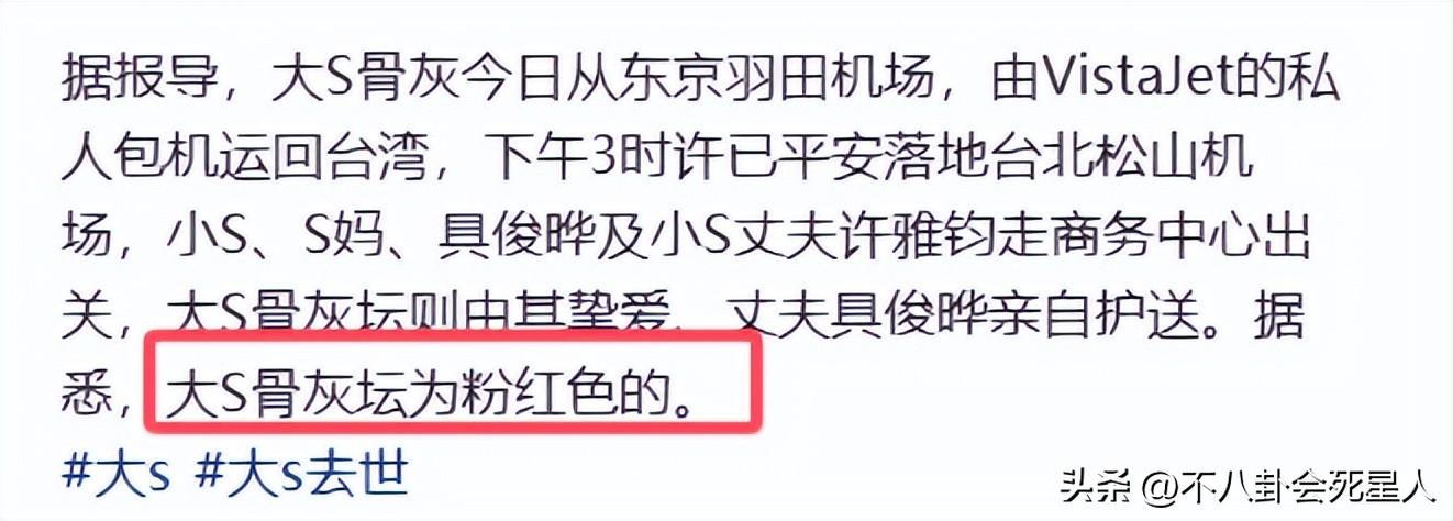 另有知情人爆料,大S的骨灰罈是粉紅色的,如果屬實,那S的家人還是遵從了大S的少女心,在這件事情上,保留了徐熙媛的個人意願。