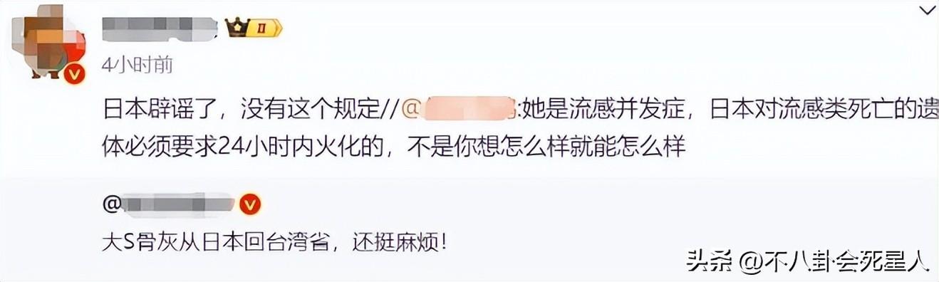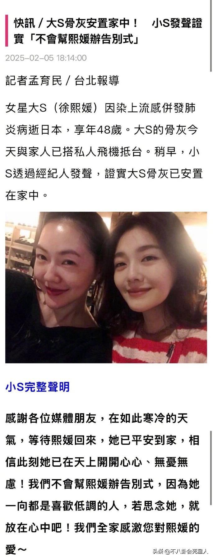 那是什麼原因讓S家人迅速做出了這樣的決定,讓大衆完全沒有任何機會見大S的最後一面,不管是親友奔赴日本送行,亦或者是在日的粉絲,都再無機會見到徐熙媛的最後一面了,真不怪網友稱其家人的舉動“好蹊蹺”。
