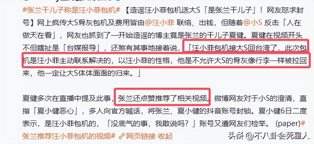 當時發佈這則消息的人,是張蘭的乾兒子夏健,他在視頻開頭煞有介事的稱是汪小菲主動聯繫的此事,並公開宣稱汪小菲不忍大S骨灰像行李一樣被拉回,故而安排了包機。