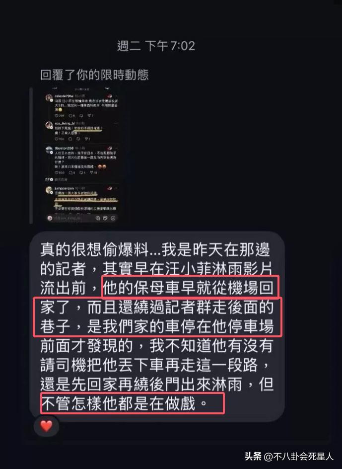 有記者稱,當天汪小菲的保姆車早就從機場回家了,車還特意從記者羣的身後繞了一圈,汪小菲到底是先下車淋雨走回家的,還是返家之後又自己出來淋雨的,這位爆料者並不確定,但他卻肯定這位前夫哥在演戲。