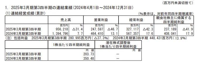 2月4日,任天堂公佈2025年3月期財報,披露了2025財年前三季度的財務狀況。