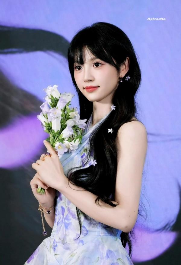仔細觀察田曦薇的髮型,你會發現她的髮絲上還點綴了幾朵紫色小花,黑紫色長裙完美呼應,氛圍感十足,一頭齊劉海大波浪,更是襯托的五官精緻又立體,撲面而來的唯美意境,攔都攔不住。
