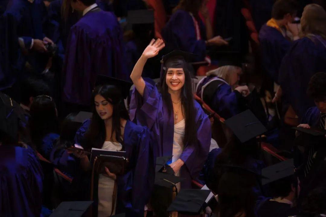 在人羣當中的許文珊,實在是太明媚陽光了,長着一張“混血臉”,無官端正立體又精緻,給人的感覺特別舒服,在紫色學士服裏面,許文珊疊穿了一件白色低胸長裙,將性感和文靜完美碰撞。