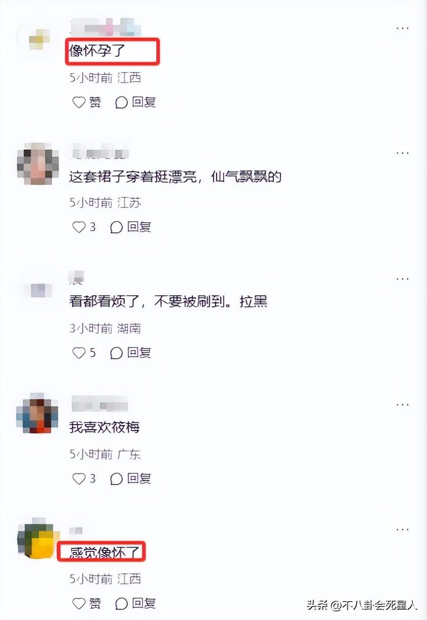 可即便是馬筱梅選了一條相對遮擋腰身的長裙,卻也在某種角度下暴露了,上電梯時,其凸起的小腹還是看得比較明顯的。