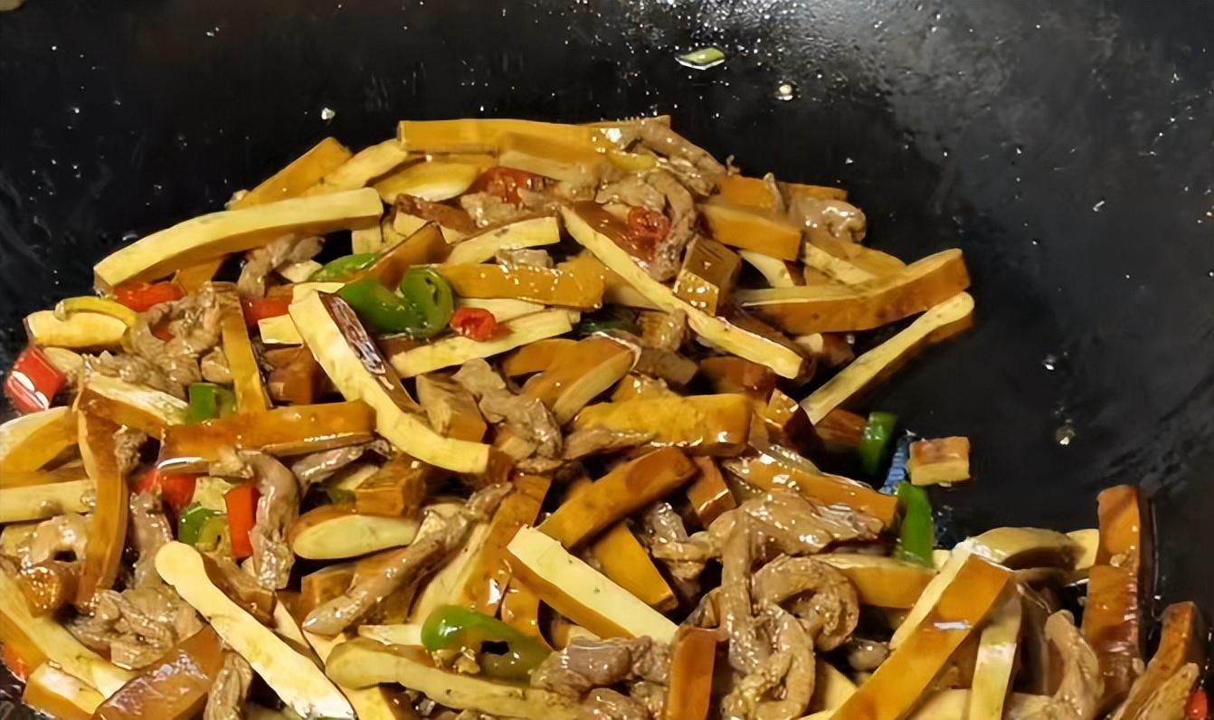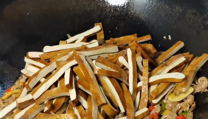 2、 將香乾切成粗條,在開水中焯燙3分鐘,撈出後過冷水瀝乾水分。