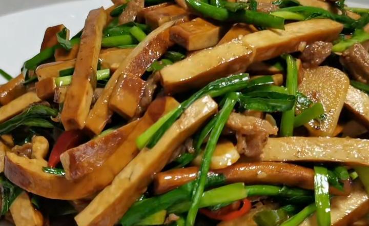食材準備:韭菜、香乾、豬肉、大蒜、生薑、小米辣。