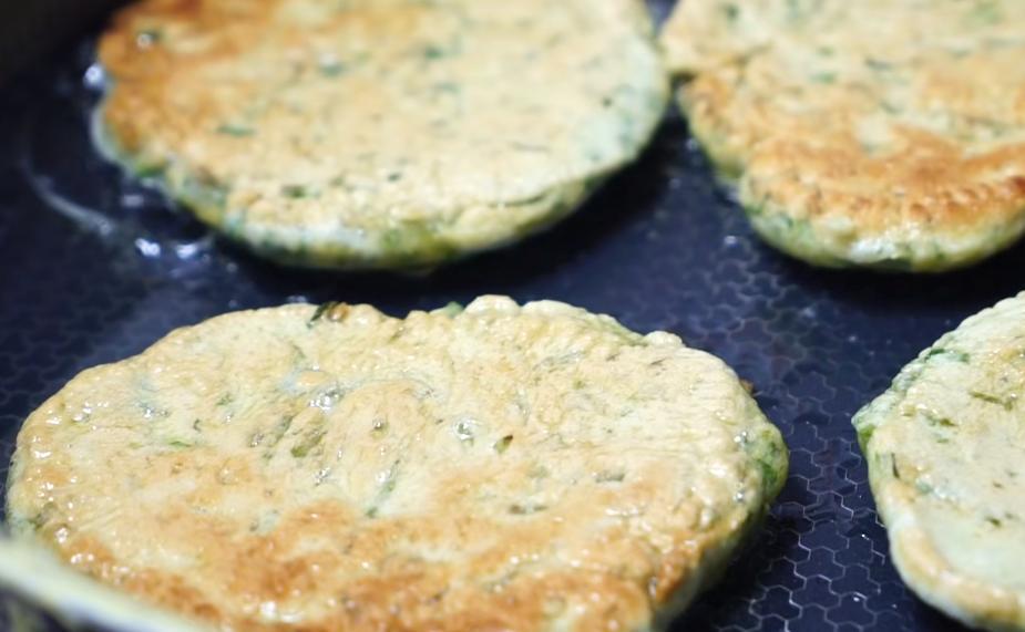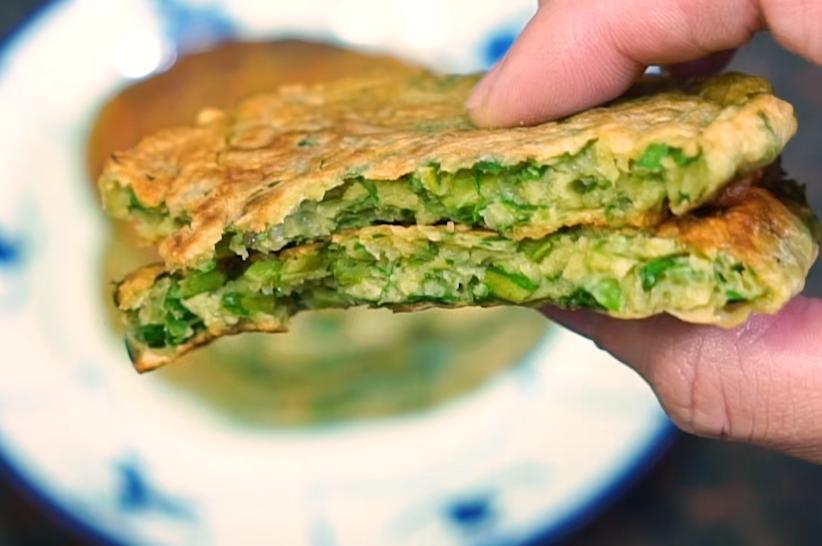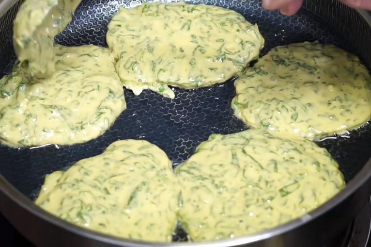 2、 準備一個平底不沾鍋,刷上適量的油,盛一勺茼蒿糊放入鍋中,定型後翻面,煎成兩面金黃色後取出就做好。