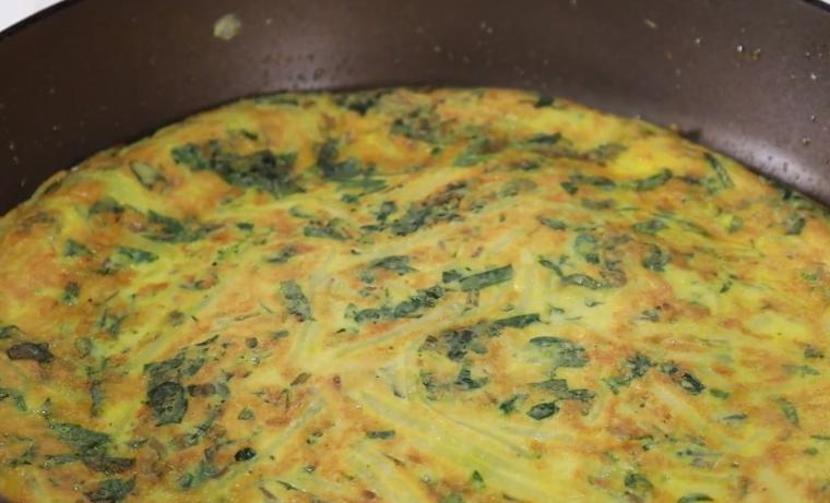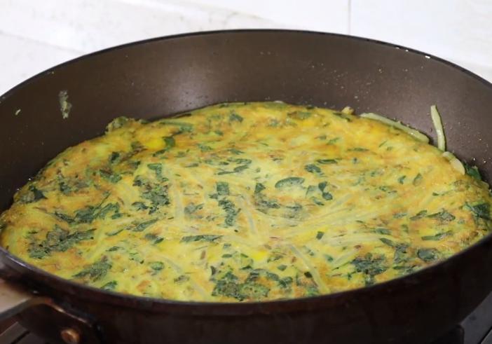 6、 熱鍋冷油,倒入食材,用勺子將食材攤平。煎至定型後翻面,將兩面將另一面煎至金黃色後取出。