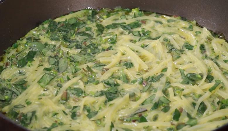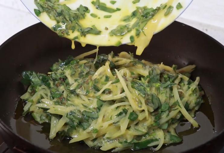 5、 將土豆絲放入雞馬齒莧,雞蛋碎中攪拌均勻。