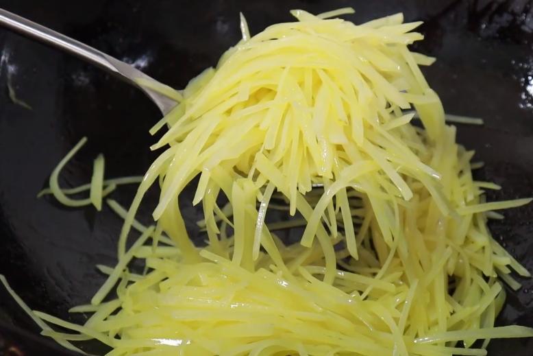 4、 熱鍋冷油,放入土豆絲翻炒至斷生後盛出。