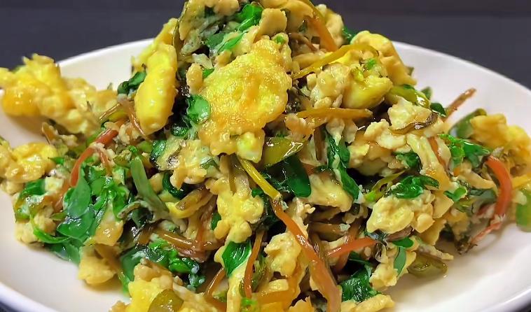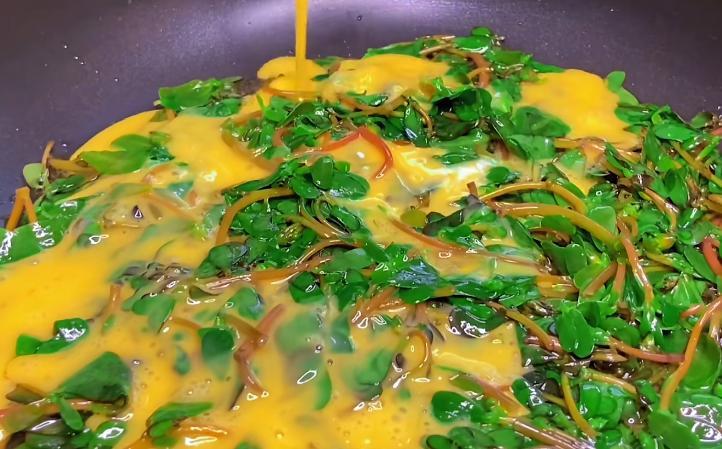 5、熱鍋冷油,將蒸好的馬齒莧放入鍋中翻炒圴勻。倒入雞蛋液。煎至定型後切成小塊。繼續煎。最後撒上食鹽調味兒就做好了。