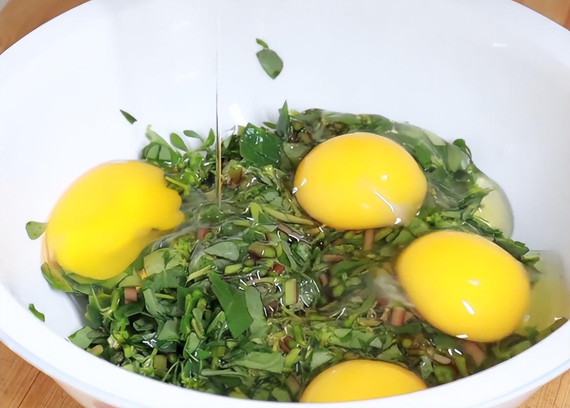 2、 準備一個大碗,放入馬齒線碎,打入三個雞蛋,加入一勺食鹽,用筷子攪拌均勻。放置一邊備用。