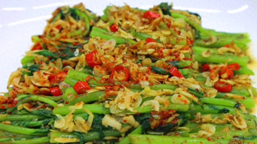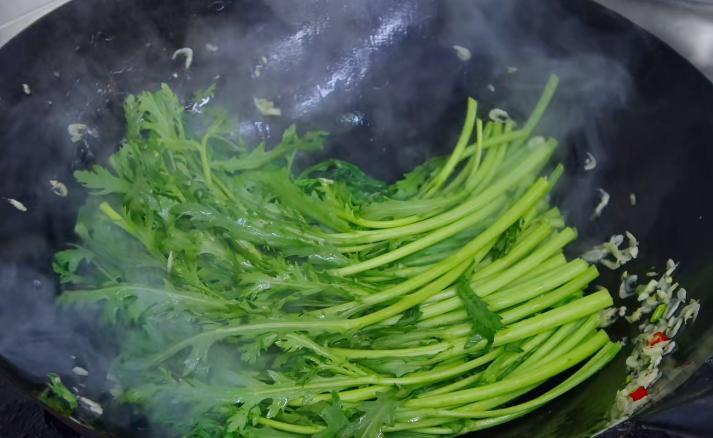4.熱鍋冷油,放入蔥蒜小米辣末炒香,再倒入蝦皮翻炒均勻,放入茼蒿用勺子按壓,使菜受熱更均勻,撒上少量食鹽,辣椒粉。將茼蒿翻面,繼續撒一層辣椒粉,淋上一小勺生抽調味,直至將茼蒿煎軟,就可以盛出裝盤。