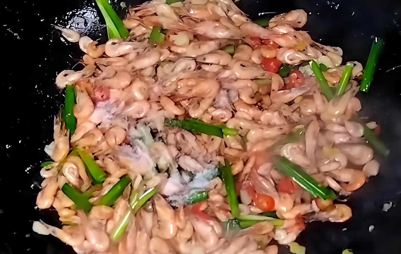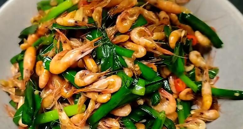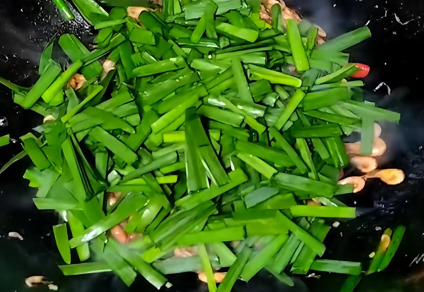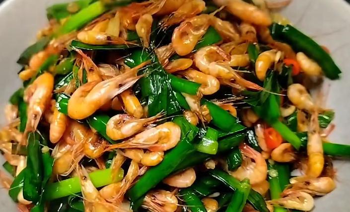5、 熱鍋熱油,放入一勺豬油融化開。將河蝦倒入鍋中爆香。接下來放入姜、蒜、辣椒,繼續炒香。翻炒一分鐘後,加入韭菜杆。放入適量的食鹽,一點點醬油上色,然後開大火翻炒均勻。最後放入韭菜葉快速翻炒。韭菜很容易熟,大概翻炒七八下就可以出鍋了。