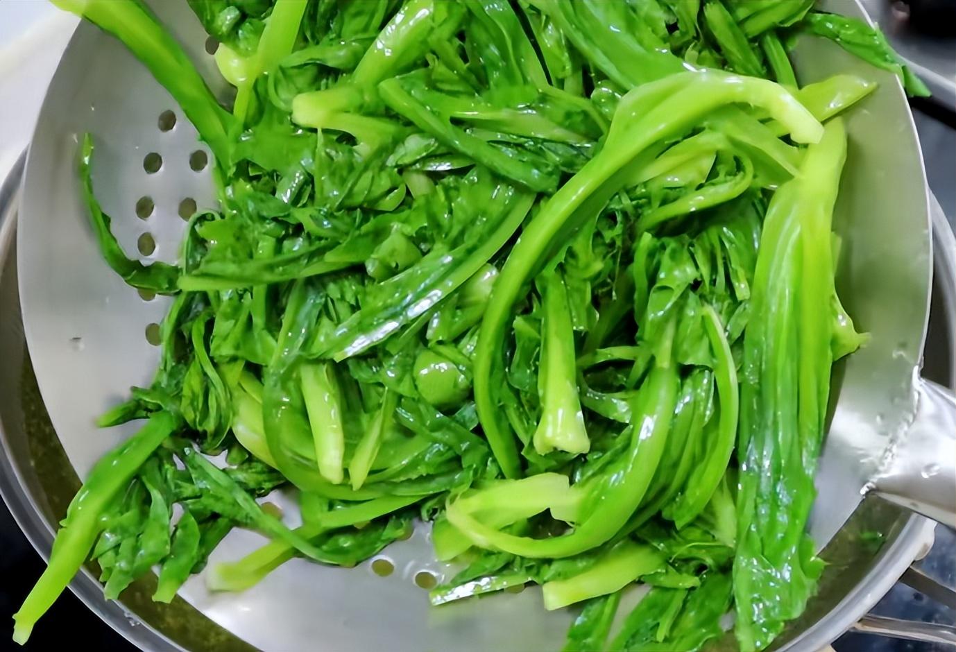 4.燒一鍋開水,放入兩小勺油,將油麥菜放入鍋中焯燙5秒,變色後撈出瀝乾水分。