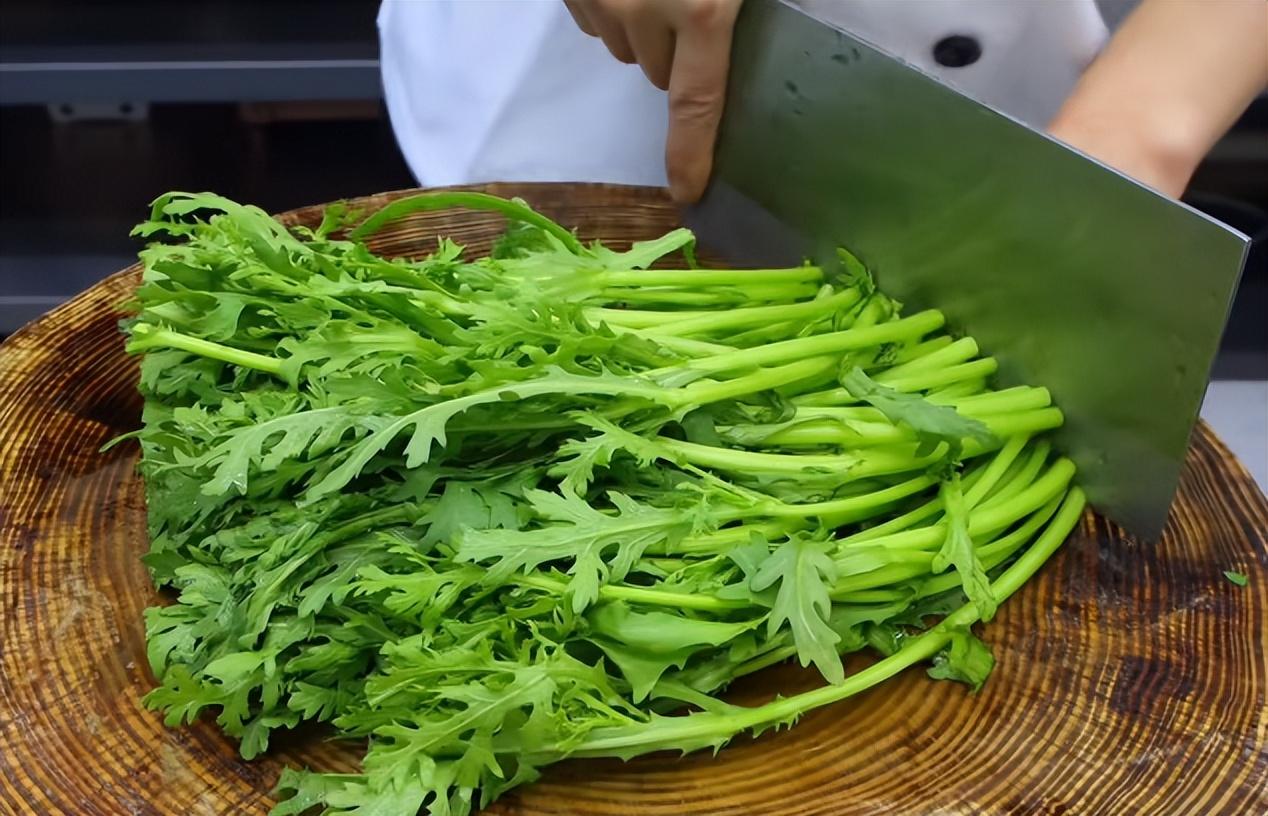1.將茼蒿清洗乾淨,切掉頭尾,只留下鮮嫩的部分。