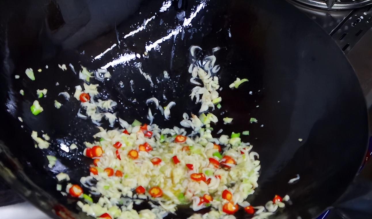 4、 最後切上一點姜蒜末,三四個小米辣,切成辣椒圈,用來增加辣味。