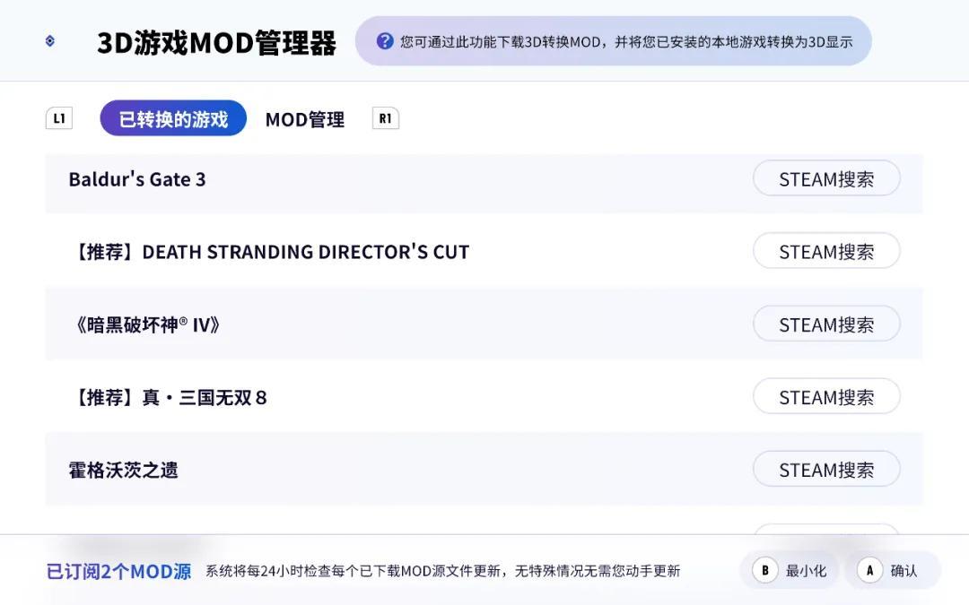 一開始,我主要集中體驗了幾款適配優化過的遊戲,如《只狼》《上古卷軸5》《輻射4》等。系統裏自帶了一個“3D遊戲MOD管理器”,能自動爲Steam和Wegame的遊戲安裝補丁,列表目前一共有幾十款已優化產品,較新的大作有《黑神話》《暗喻幻想》《裝甲核心6》《匹諾曹的謊言》等。