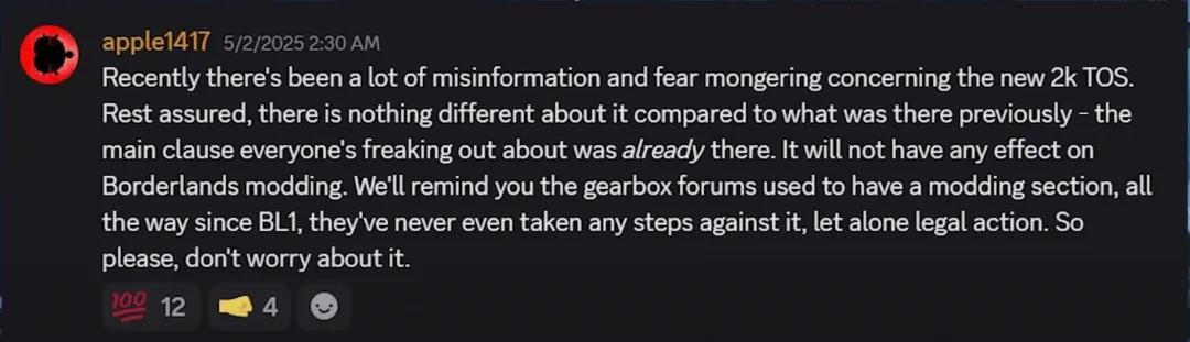 像是《無主之地2》的Mod作者apple1417就表示,這份協議並不會帶來實質性影響,Gearbox和2K從未乾涉過Mod製作,更別提法律追責一說。