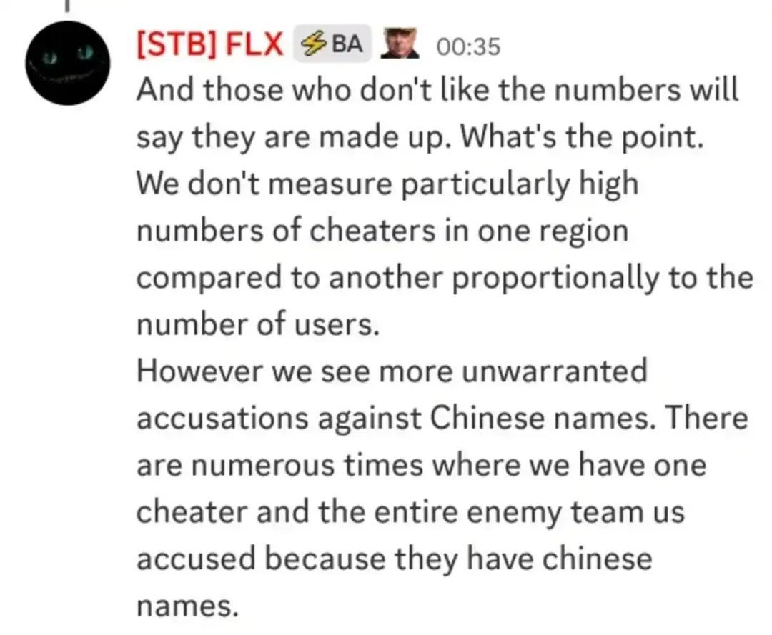 “我們並沒有觀測到某個地區的作弊者數量在與用戶總數成比例的前提下,相比其他地區特別高。然而,我們確實看到越來越多針對中文名字的不實指控,有很多次,我們明明只發現一個作弊者,但整支敵方隊伍都被指控作弊,只因爲他們的ID是中文……”