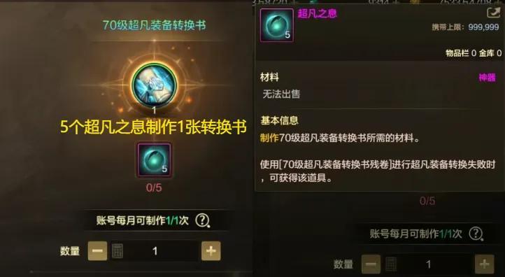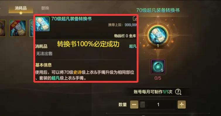 5個超凡之息可製作1張超凡裝備轉換書,而這個轉換書則是100%必定可升級成功的!