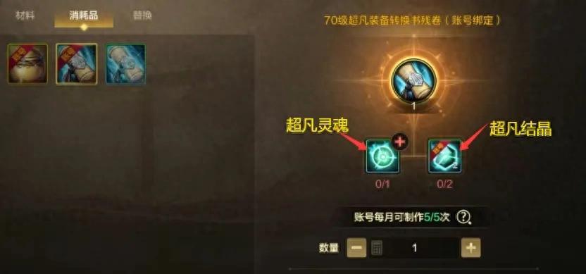 第一,我們可以用「2個超凡結晶+1個超凡靈魂」製作1張超凡裝備轉換書(破券子),有一定概率直接升級超凡裝備,失敗則獲得1個超凡之息;