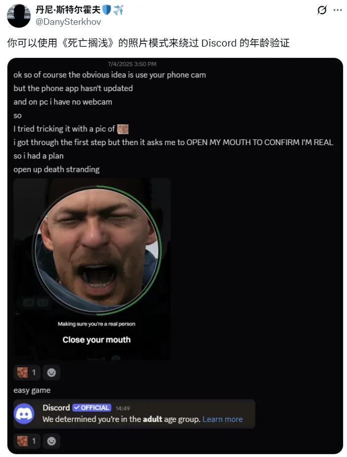 以國外通訊平臺Discord的驗證爲例,它們的驗證系統很簡單,確定完這是“人臉”後,再要求用戶做幾下張嘴閉嘴的表情就結束了,對《死亡擱淺》來說自然不是難題。