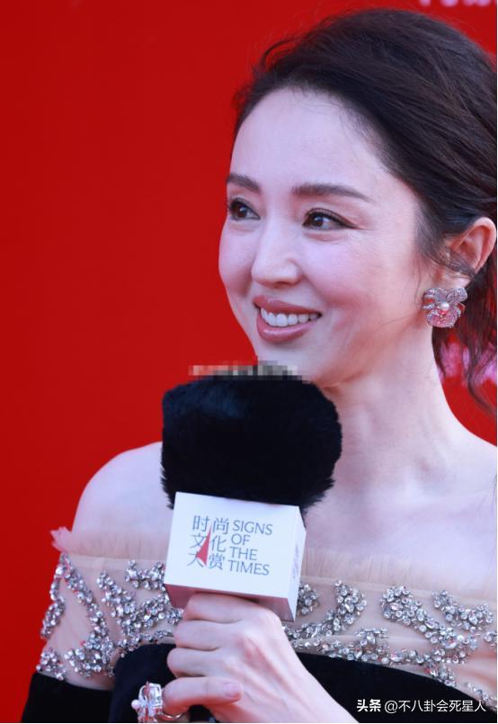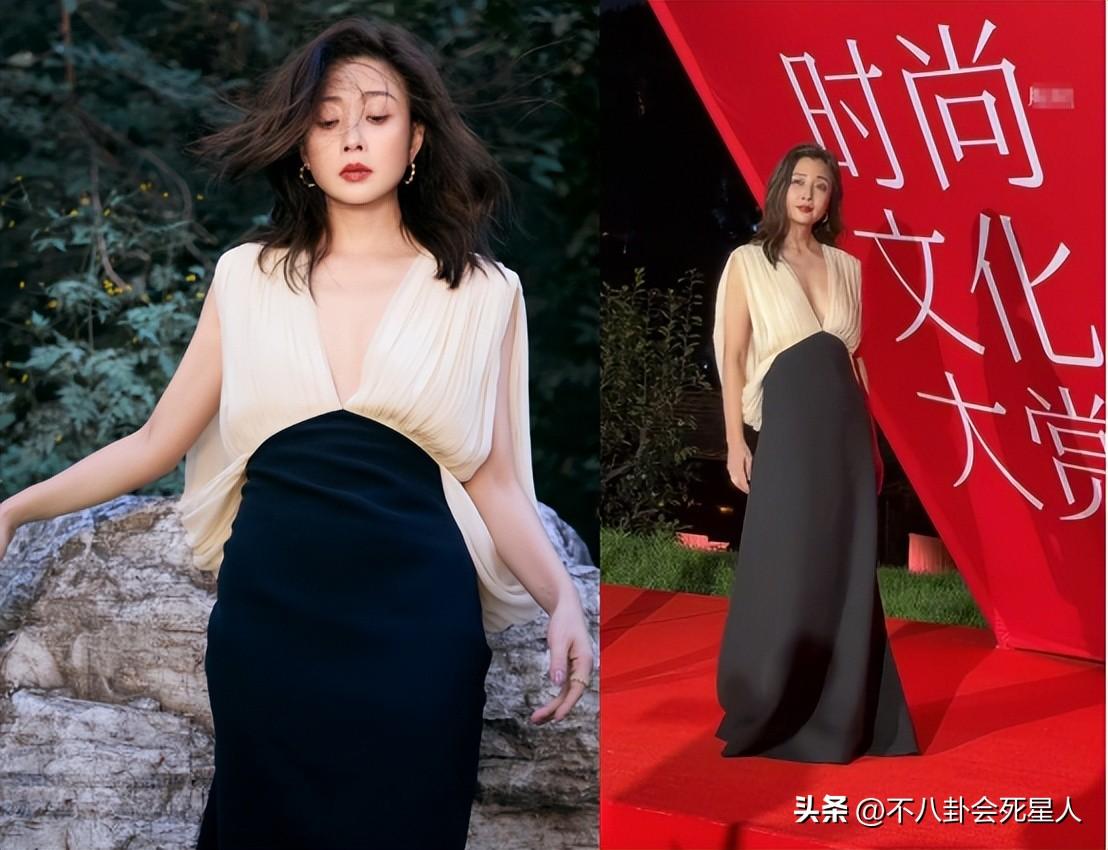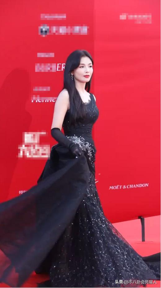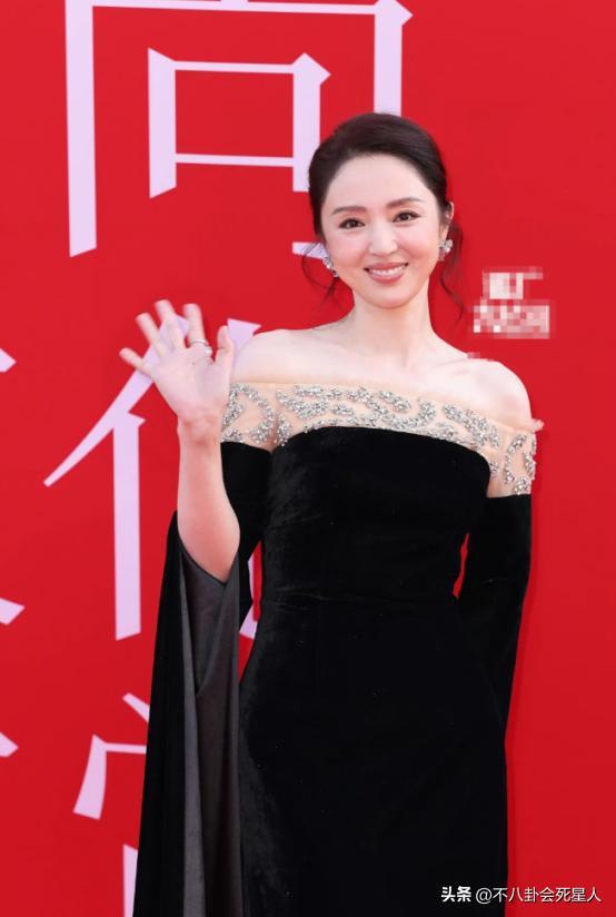 董璇以一套露肩絲絨質地的修身款禮服亮相,黑色鑲金邊的肩部細節,非常符合她溫婉優雅的氣質。