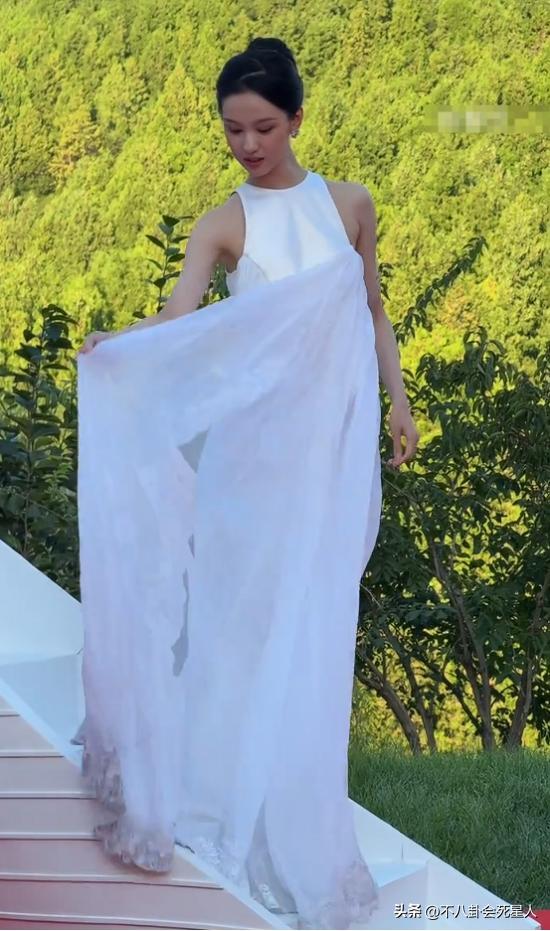 周冬雨意識到風向之後,隨機轉換身體,讓白色的飄帶成了畫面中完美的構圖。估計品牌方要開心了,這麼能借風展示禮服的藝人實屬難得。