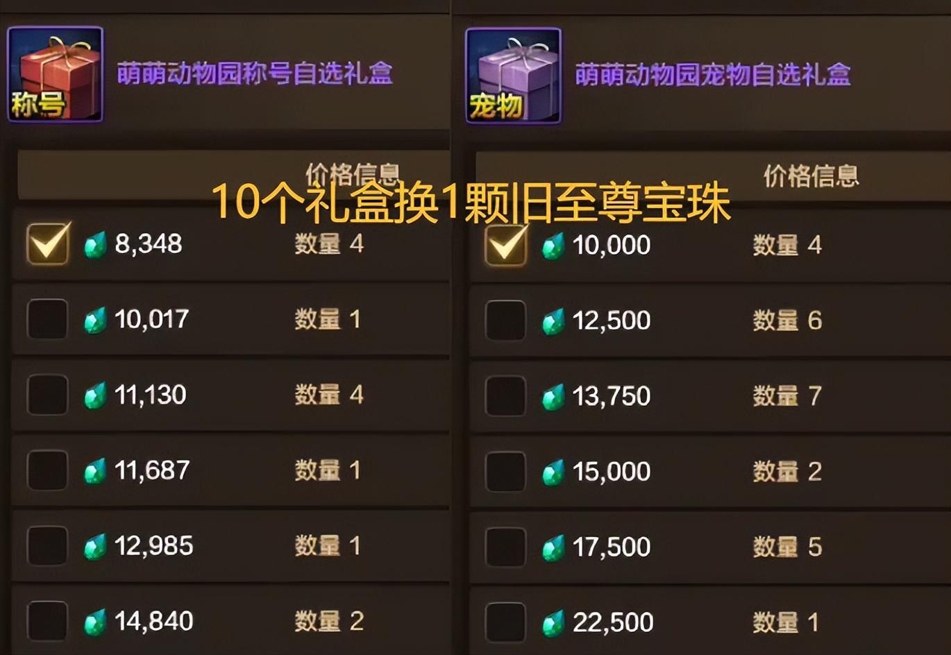 所以整個流程就是這樣的:我們可以從拍賣行購買“寵物禮盒”和“稱號禮盒”,然後去兌換積分、再用積分兌換去年的“舊至尊寶珠”!