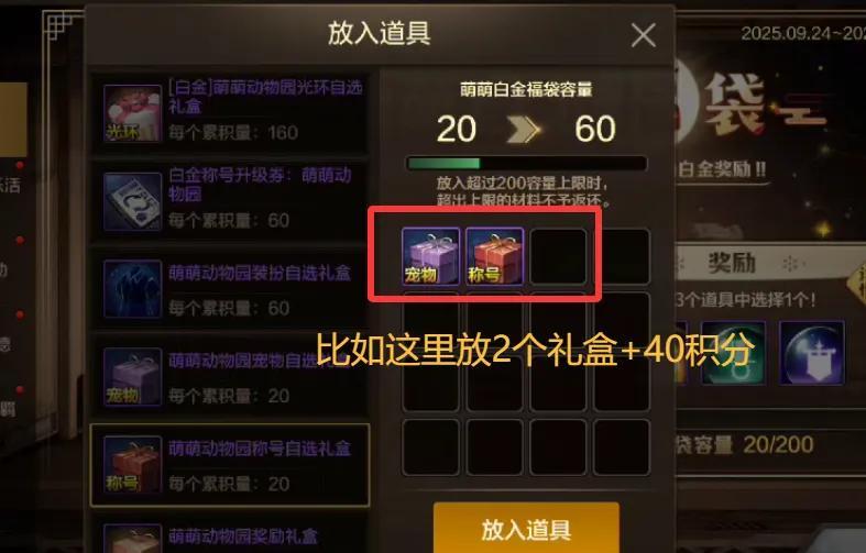 答:每一個“寵物禮盒”或“稱號禮盒”,都可以換20點積分!