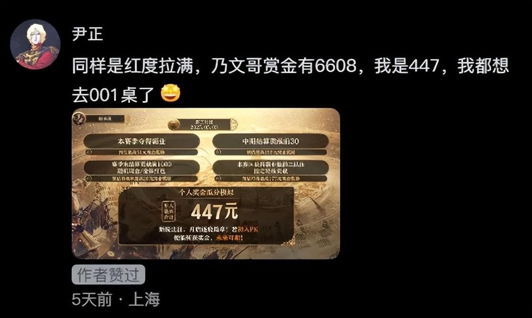 不過,這場一億現金賽帶來的出圈效應還遠不止於此,甚至蔓延到了明星玩家圈層。知名演員尹正在官方評論區下曬出模擬賞金截圖並“喊話”李乃文,作爲多年三戰老玩家的李乃文也向粉絲髮出組隊參與打金服的邀請,而前萌新前國腳“大帝”李毅的亂入,以及尹正在當天的抽卡直播等動作,又進一步拉高了六週年慶的大衆話題度。