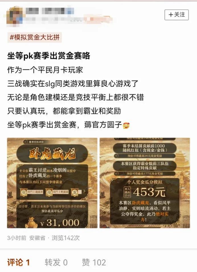 更值得一提的是,三戰的一億現金在一個透明而又巧妙的規則約束下,不僅僅是給高戰、滿紅、金主等慣性思維中的“大佬”送溫暖,而是能真正覆蓋到更廣泛的大衆玩家羣體。賽事採用段位定獎池的新機制,根據隊伍成員首月貢獻、霸業獲取情況和賽區強度評估段位,對應不同賞金級別。個人獎金由霸業獎金、榮耀貢獻獎金、活躍紅包獎金以及三甲之師獎金構成。多元獎金的構成意味着更多的參與機會與可能。不少平民玩家及月卡黨通過官方賞金模擬器測算後發現,依據貢獻機制,個人實際可分得數百至上千元不等的獎勵。大量用戶在社區曬出截圖並表示“難以置信玩SLG也能‘打金賺錢’”,這進一步突顯了遊戲的公平性與激勵實效。