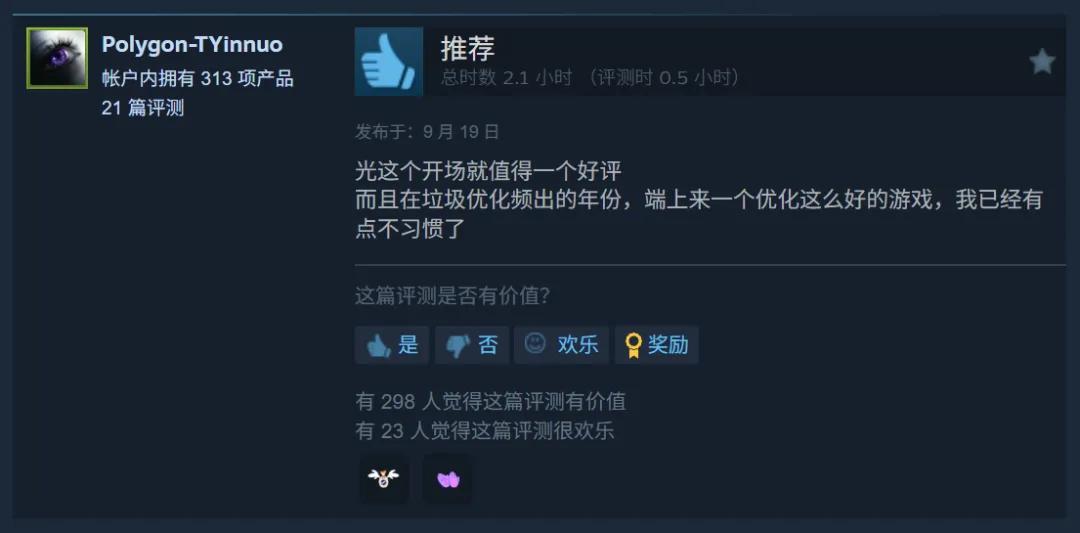 比如在《困獸》Steam的評測留言裏,很容易見到有玩家在讚歎《困獸》的優化效果驚人,用當下大衆化的配置,就能跑出極佳的畫面與流暢性,簡直到了“黑科技”的程度。