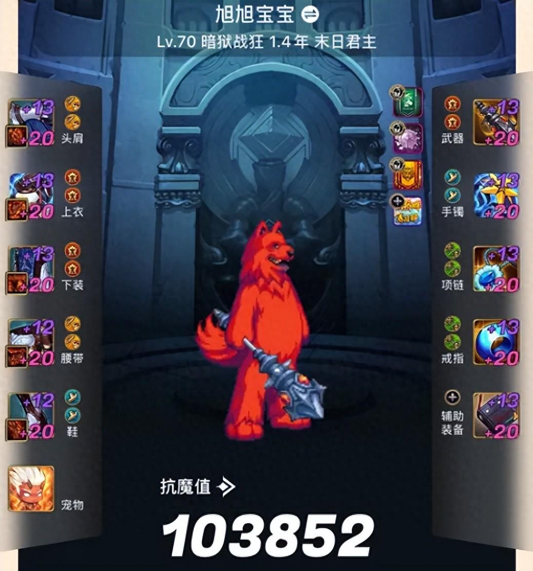 目前還剩下3個部位的貼膜沒有升級到史詩,不過也就是時間問題而已了,完美狀態下估計可以達到10.4萬以上的抗魔值!