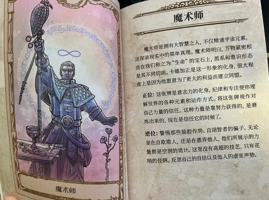 最後一張代表未來的牌則是逆位的魔術師,牌面是玩家的老朋友大法師卡德加。總之這也是上上籤,因爲卡德加手持的法杖埃提耶什上有一隻烏鴉,而烏鴉在我國古代往往是凶兆,那麼逆位的烏鴉想必是大大的吉兆。