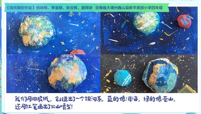 四位小學生用舊報紙、顏料創作出了一個“銀河系”,他們給自己的作品配文:“藍的像洱海,綠的像蒼山,還用紅筆畫出了火山噴發!”