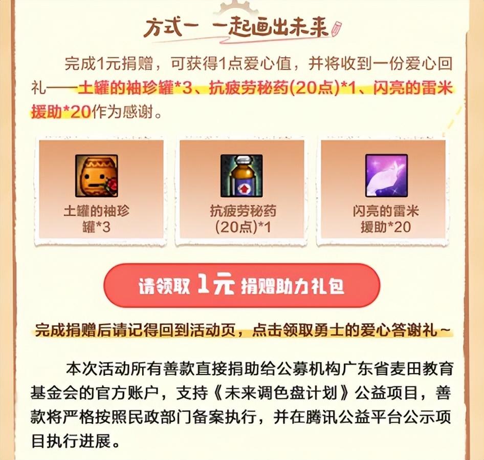 其一是玩家只需捐出1元,便可收到官方誠意回贈的愛心回禮,主要是遊戲內一些常用的消耗性道具。