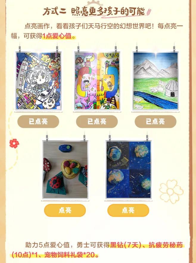 所有《地下城與勇士》玩家都能在活動首頁看到他們的作品,還能按下“點亮”按鈕給畫作點贊,累積愛心值,在全服愛心值達到一定數量後,遊戲方還承諾將以全體玩家的名義,爲更多所鄉村學校提供捐贈資助:包含美術工具及特色鄉土美育物資,融合地方特色的美育課程指南與工具,支持開展鄉土文化藝術節等活動……
