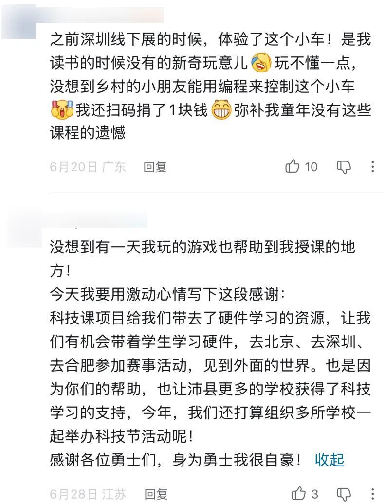 在這種形式的影響下,公益不再是大衆刻板印象裏的“作秀”,而是極具互動性,資金流向透明,資助結果清晰明瞭的善舉。比如去年百萬名勇士參與的“送給孩子們一堂科技課”的公益活動結束後,官方不僅公佈了詳細的善款流向、受益學校名單、課程落地等數據,還有公益紀錄片形式的持續回訪,任何關注後續實際行動的玩家,都能肉眼可見地看到自己的支持落在何處。