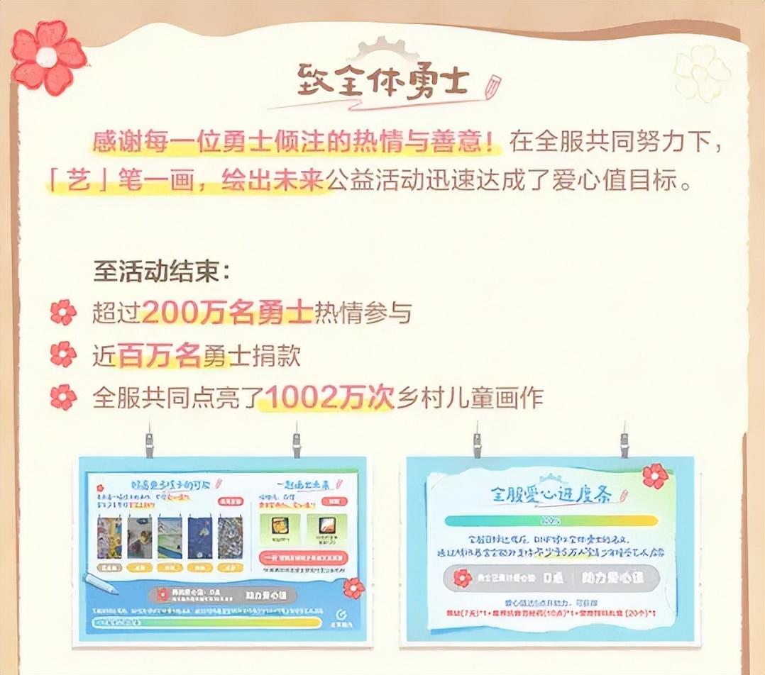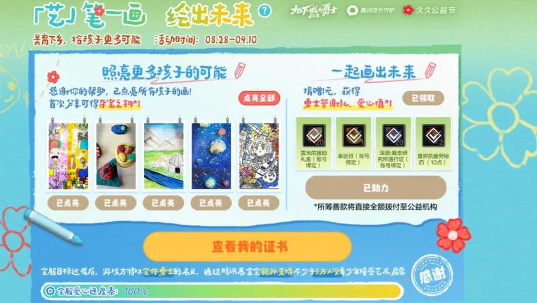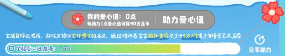 除了玩家側的便捷操作外,官方還爲這次公益設置了一個全服助力目標,只要全服玩家共同達成一定的愛心值,官方還會以“全體勇士”的名義,額外支持不少於10萬人次的青少年接受藝術啓蒙教育。