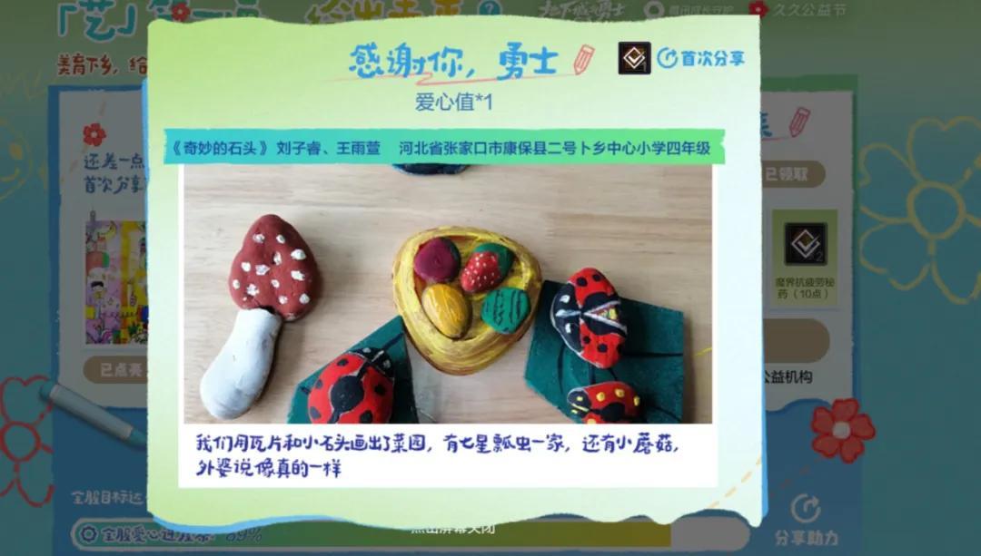 活動期間,共有超過200萬名勇士參與了公益互動,積極爲鄉村美育出力;其中近百萬名玩家通過平臺完成了1元捐款,熱心支持鄉村兒童藝術教育。全服玩家還累計點亮了1002萬次鄉村兒童畫作,讓他們的創意和夢想被更多人看見。