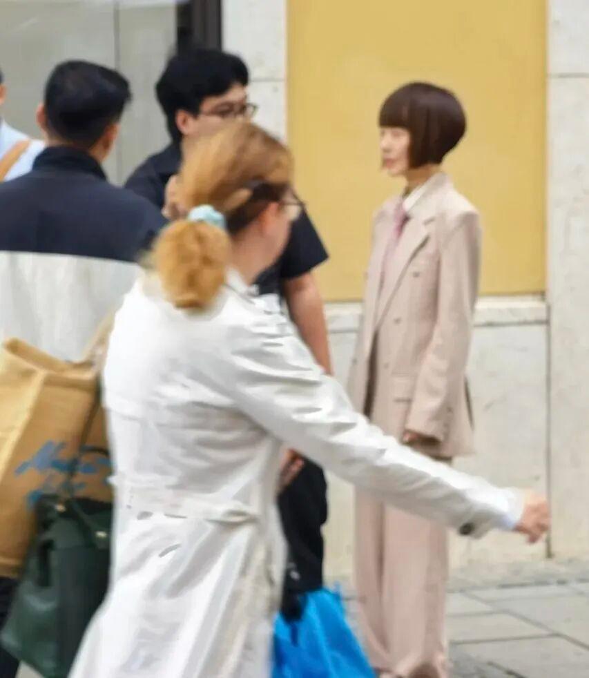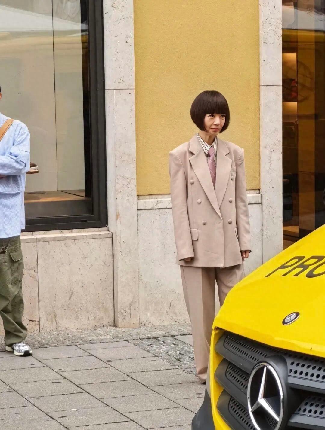 原本尺碼正常的西服套裝,被魯豫穿成了oversize的版型,寬大的西裝,導致頭肩比非常不協調,再加上衣襬太長,全身照特別顯腿短,留着一頭標誌性的短髮,臉上瘦的都凹陷進去了。