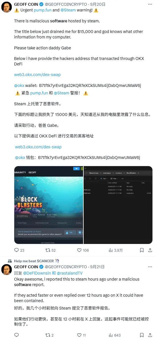 9月20日,第一個站出來的受害者GEOFF COIN吹響了警哨:他下載了《BlockBlasters》,打開以後,損失了加密貨幣錢包裏價值約15000美元的貨幣,或許還泄露了更多信息。