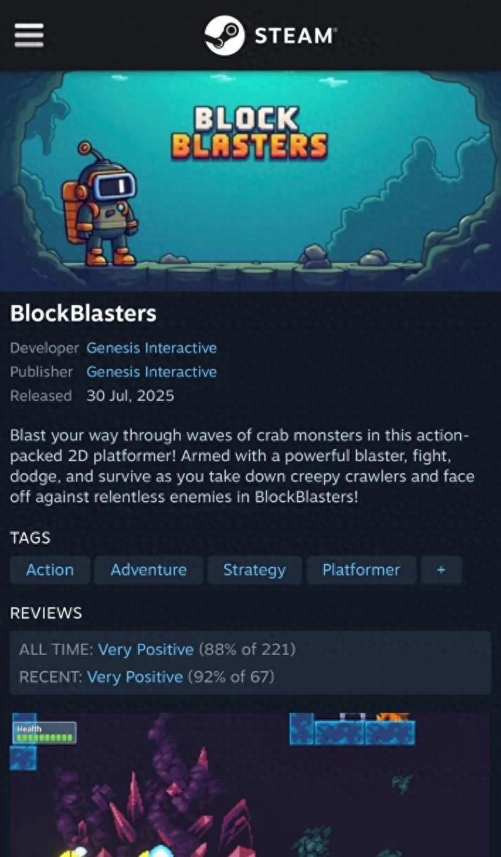 7月30日,2D橫版冒險遊戲《BlockBlasters》上架,近兩個月來,遊玩人數不多,卻得到了高達88%的好評,說明本身質量還算過關。